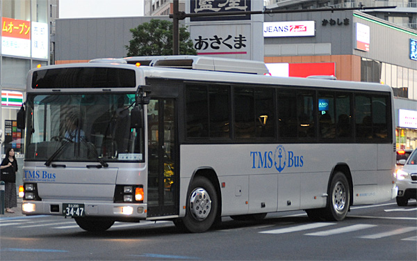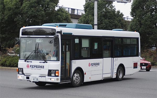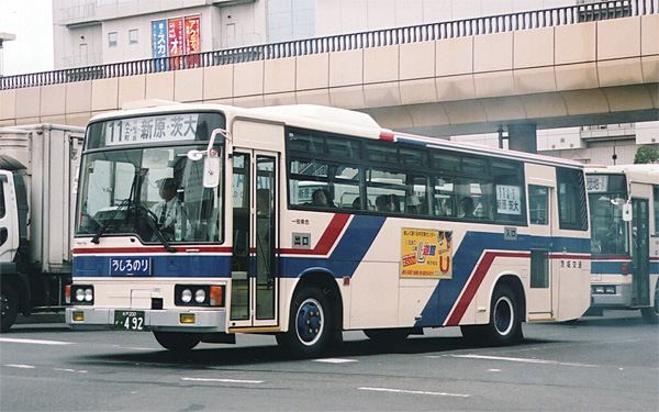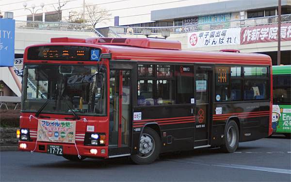 元阪急田園バスのMK前後引戸で、前面窓が視野拡大仕様になっています。 |